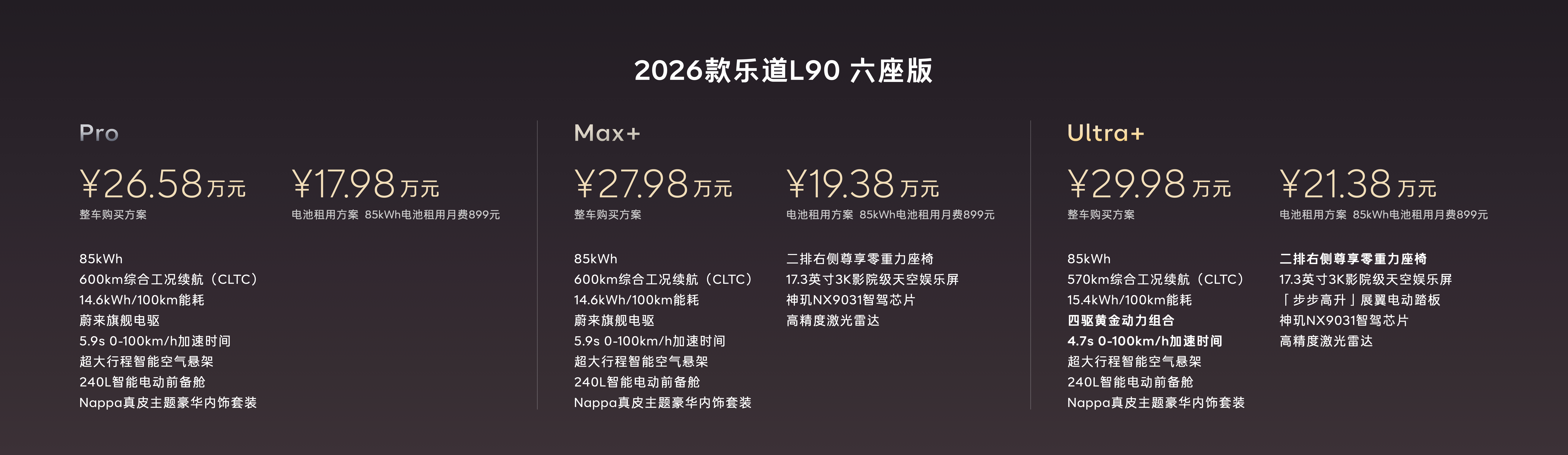 六座版 Pro,整车购买售价为 26.58 万元,采用 BaaS 电池租用方案的售价则为 17.98 万元;