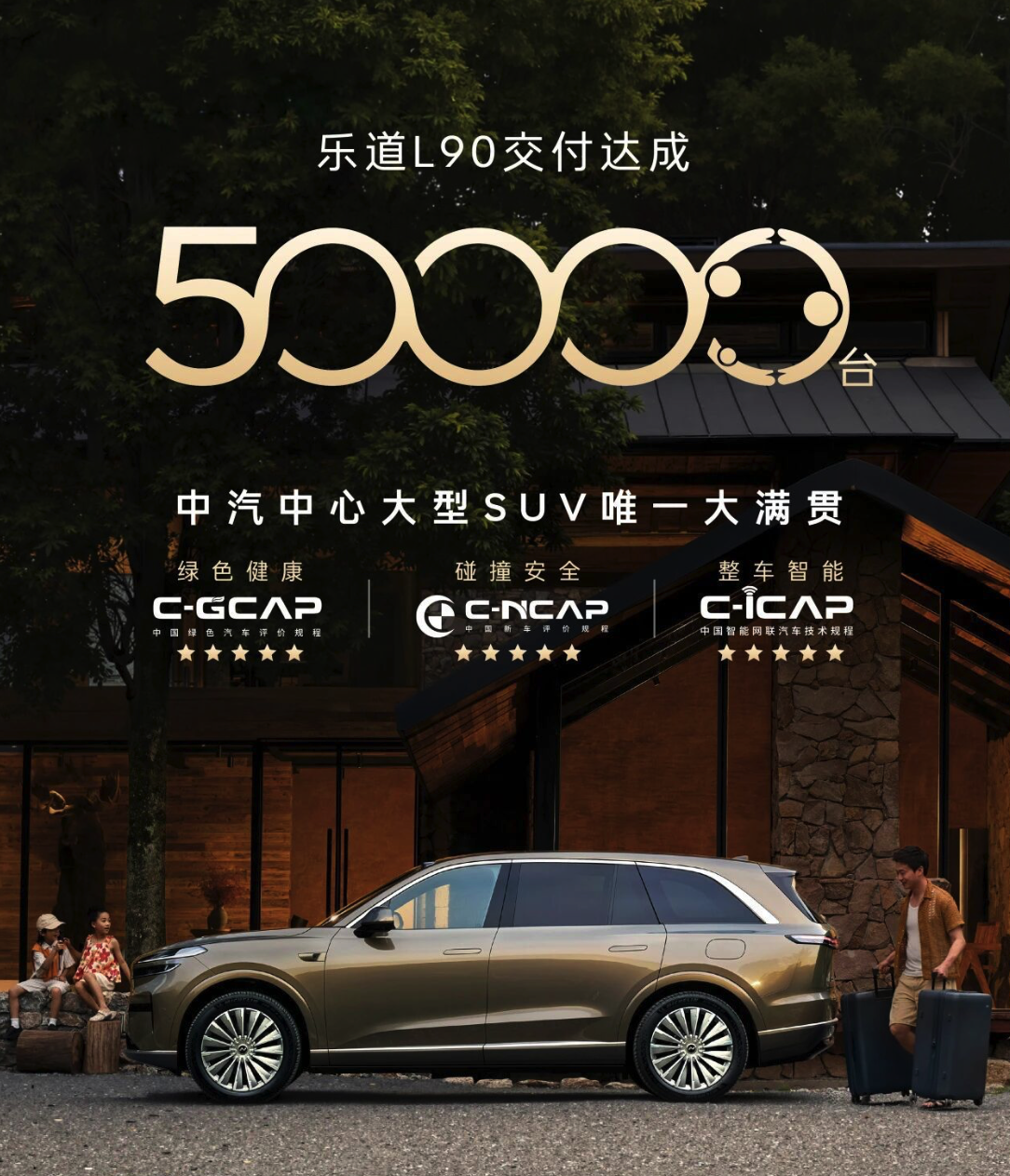 截止到今年 4 月 3 日,乐道 L90 共交付了 5 万台,是 30 万级别大型 SUV 的销量冠军。