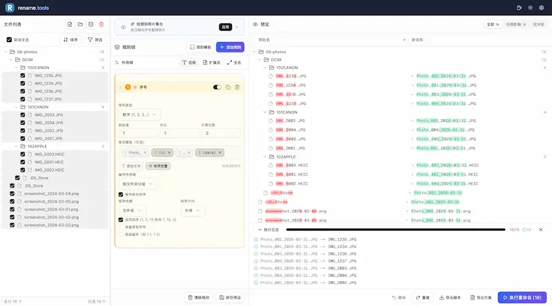 浏览器端的批量文件重命名工具,支持各种规则设定,代码开源。(@chenz24 投稿)