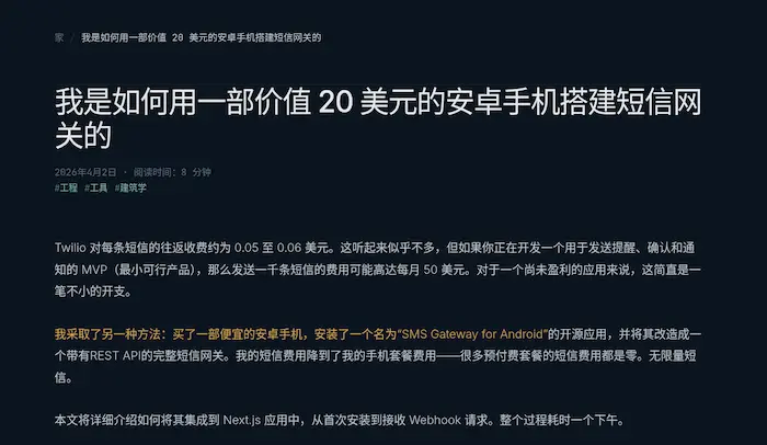 作者介绍如何在一部二手的安卓手机上,安装一个短信网关,通过网络收发短信(使用你自己的套餐)。