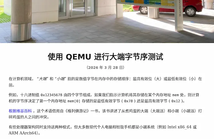 一篇 C 语言的初级教程,在本机上通过 qemu 虚拟机,运行一个不到十行的程序,就能查看某个架构是大端还是小端字节序。