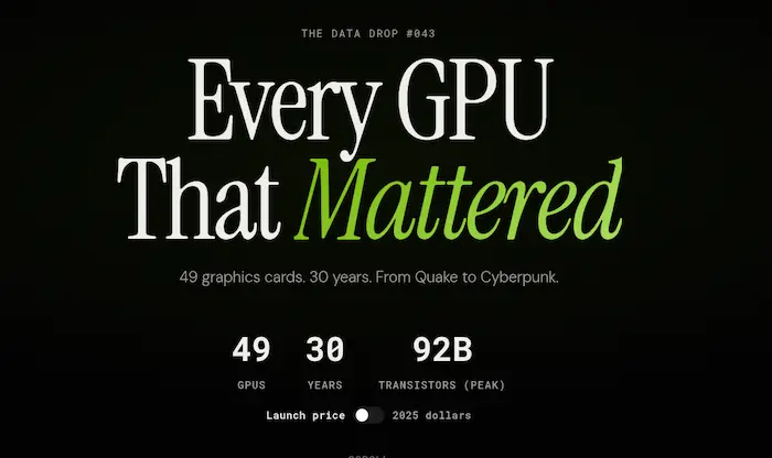 这个网站用图片展示了 GPU 显卡的发展历程,从1996年的 Voodoo 卡到2025年的 RTX 5090 显卡。