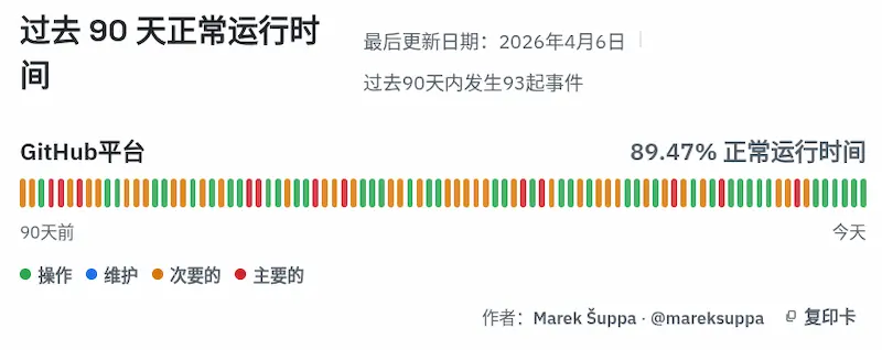 上图显示,GitHub 过去三个月的正常运行时间只有89.47%,合格数字应该是99.99%。