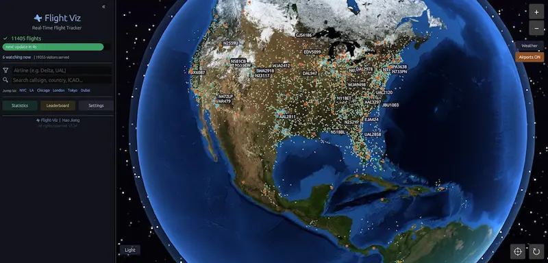 实时 3D 显示全球的航班。(@haojiang99 投稿)