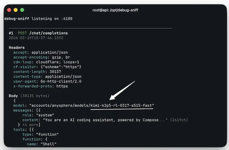 真相就暴露了,它请求的模型 ID 居然是 kimi-k2p5-rl-0317-s515-fast(下图)。