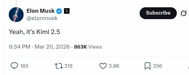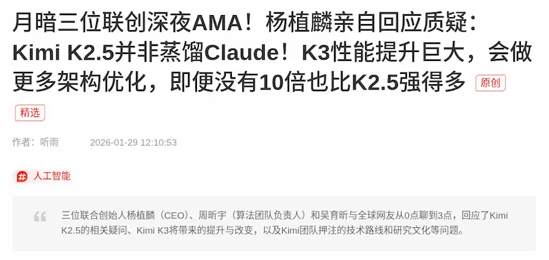 但是为时已晚,网上传遍了,就连马斯克也发推:"它就是 Kimi K2.5"。
