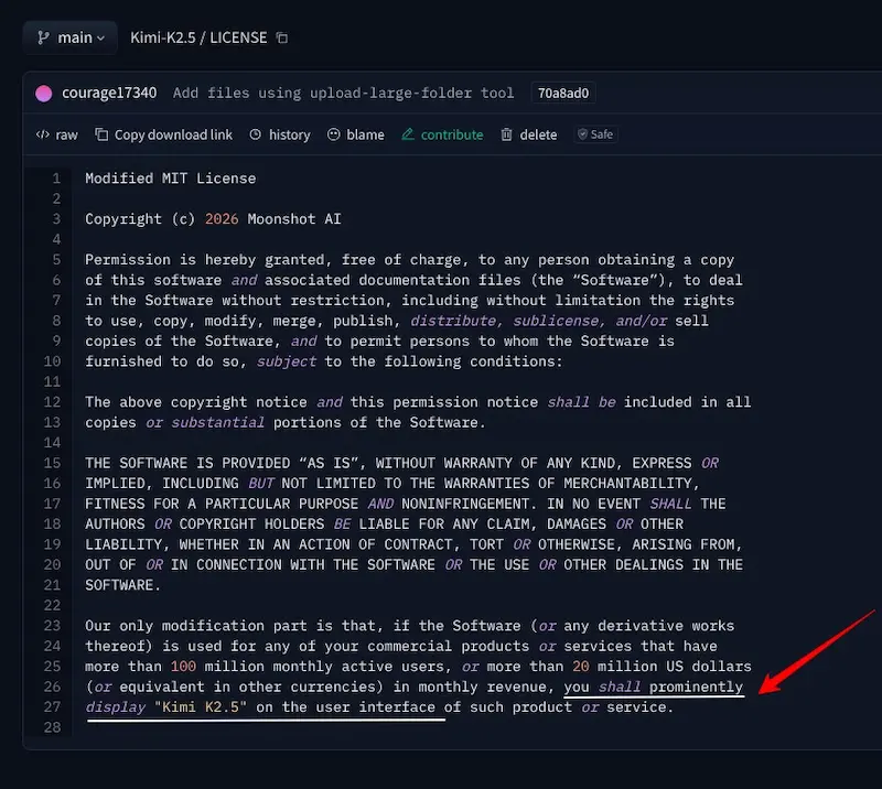 许可证这样说:你可以任意使用这个模型,唯一的条件是如果你的商业产品月活用户超过1亿,或者月收入超过2000万美元,你必须在用户界面的醒目位置披露,你使用了 Kimi K2.5