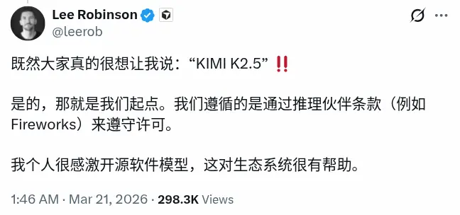 他承认确实使用 Kimi K2.5,但是没有侵权,他们的许可证来自合作伙伴 Fireworks AI。