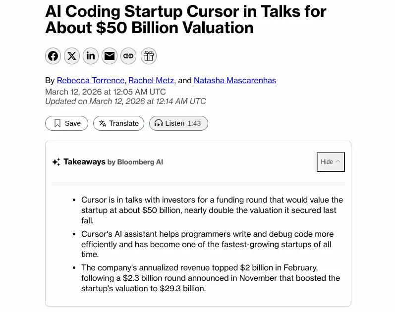 彭博社本月报道,Cursor 正在进行下一轮融资,估值达到500亿美元。