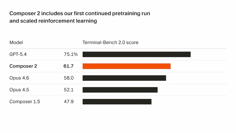 Composer 2 的性能低于 GPT-5.4,但高于 Opus 4.6。