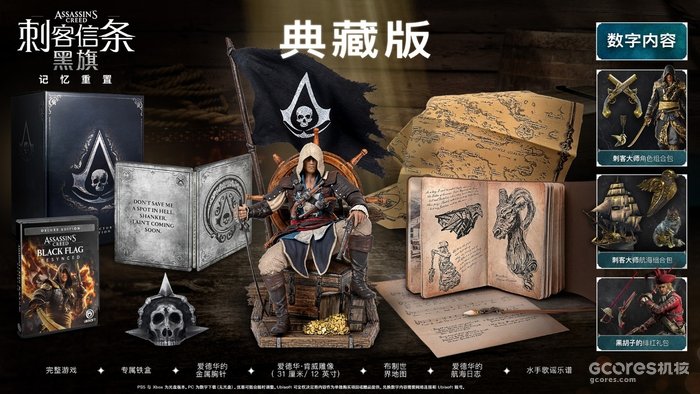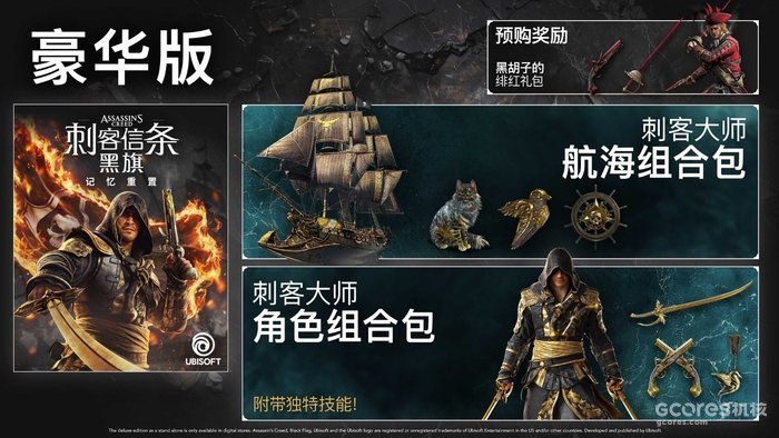 目前,《刺客信条:黑旗 记忆重置》**PC版预购已在育碧商城、Steam以及小黑盒开启,预购游戏的玩家将获赠黑胡子的绯红礼包,内含爱德华·肯威专属服装一套、对剑及手枪一组。《刺客信条:黑旗 记忆重置》不同版本内容如下: