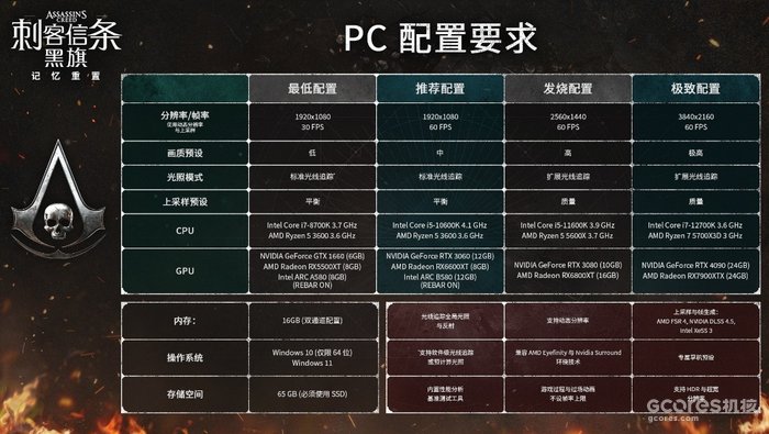 《刺客信条:黑旗 记忆重置》PC版配置信息也已正式公布,详情请查下方配置表。