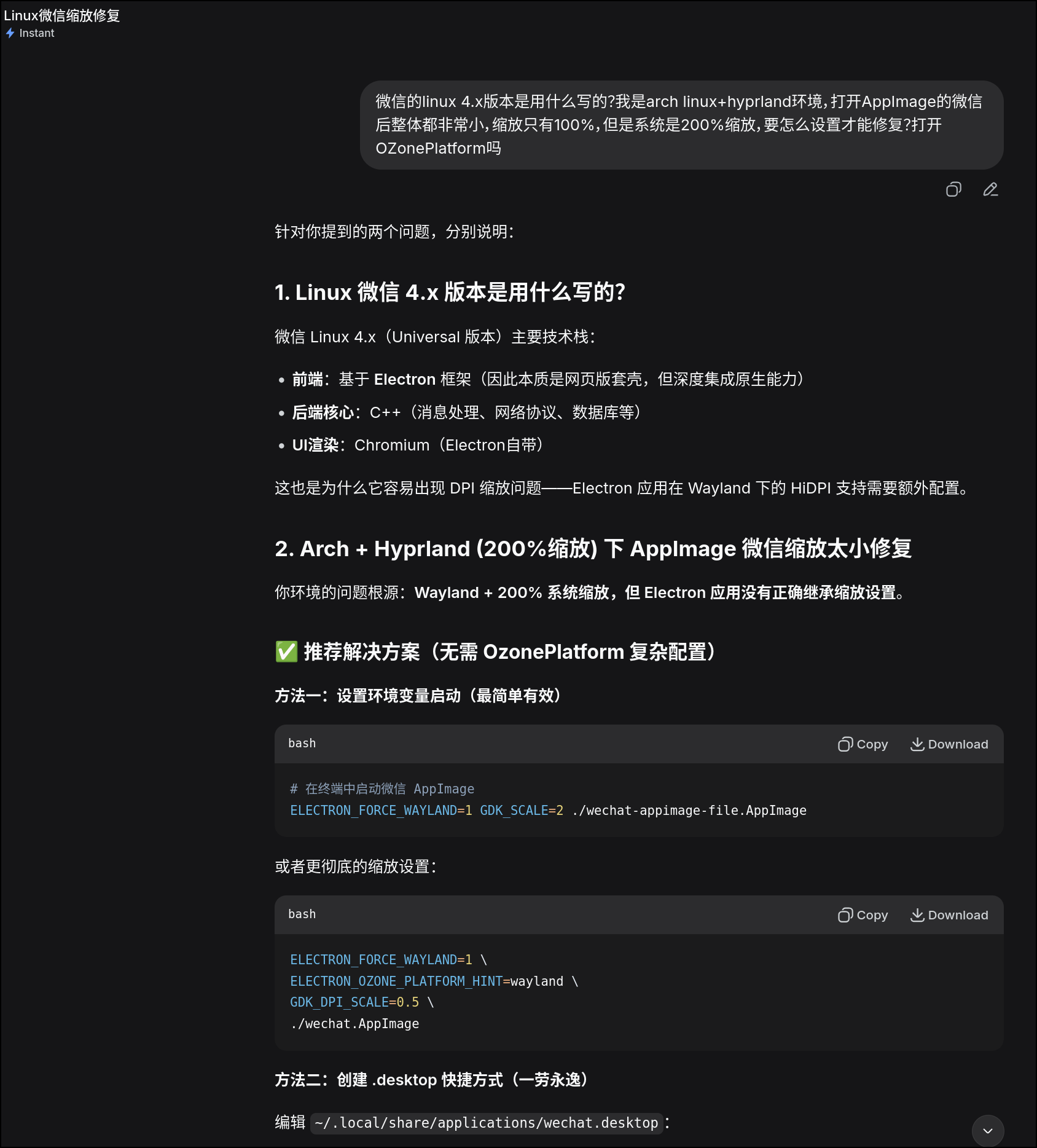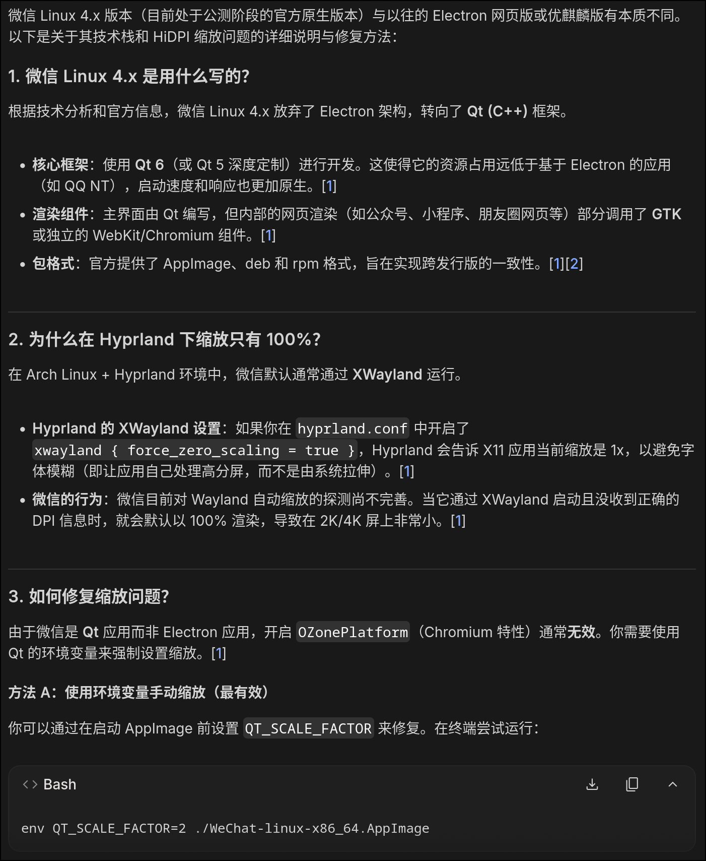 > Arch Linux + Hyprland ,4K 120hz 的 16 寸笔记本 200%缩放桌面环境下运行 4.0 版的微信 AppImage ,缩放异常,让 AI 识别并修复。还不错,正确的回答出了微信 Linux 4.0 版的技术栈,并且没有被我的提示词里猜测是 Eletron 系 App 而给出的修复参数给误导,给出了正确的缩放修复操作。