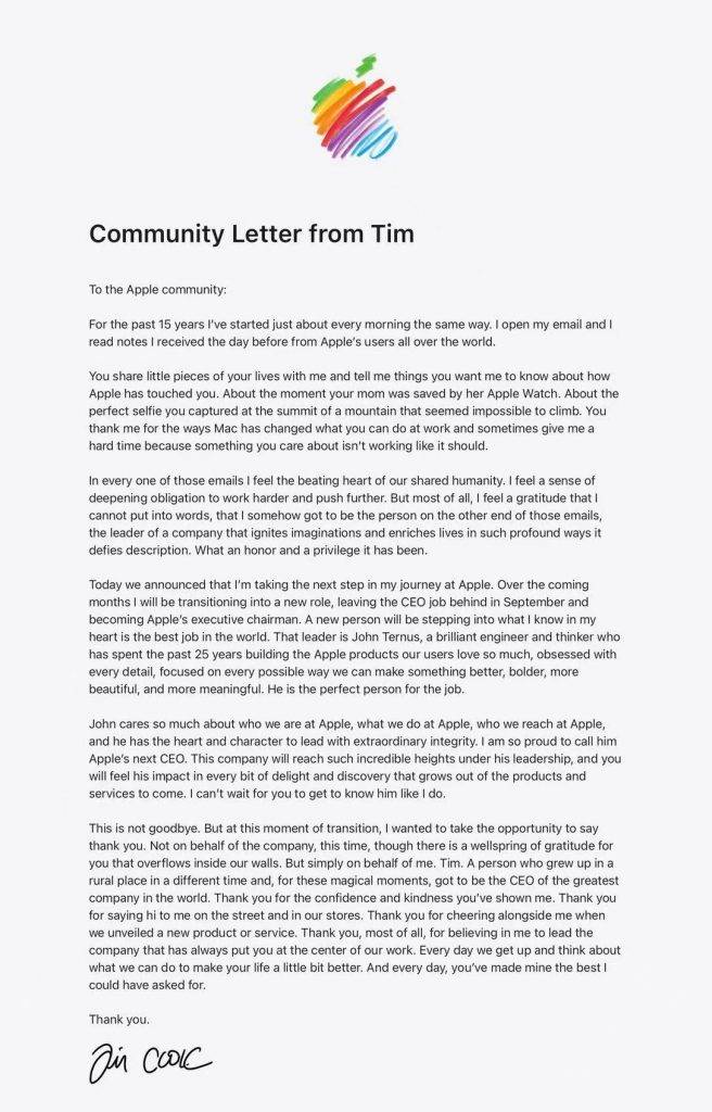 即将卸任 CEO 的蒂姆 · 库克,也在今天向全球苹果用户发布了一封感谢信,感谢用户在他 15 年的任期之中每天分享自己使用苹果产品的生活点滴。