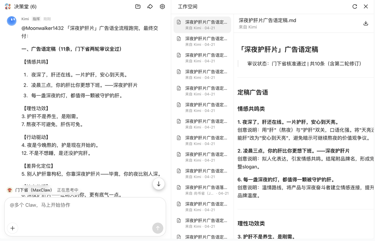 接着我们 @Kimi 现在为「深夜护肝片」品牌讨论广告语,@ 中书省负责草拟创意广告语,@ 门下省(MaxClaw)进行严苛审议与封驳;若未获通过,则发回 @ 中书省二次修正;直至 @ 门下省(MaxClaw)核准通过后,再交由 @ 尚书省(JVSClaw)安排 @ 工部落实场景的模拟与执行。