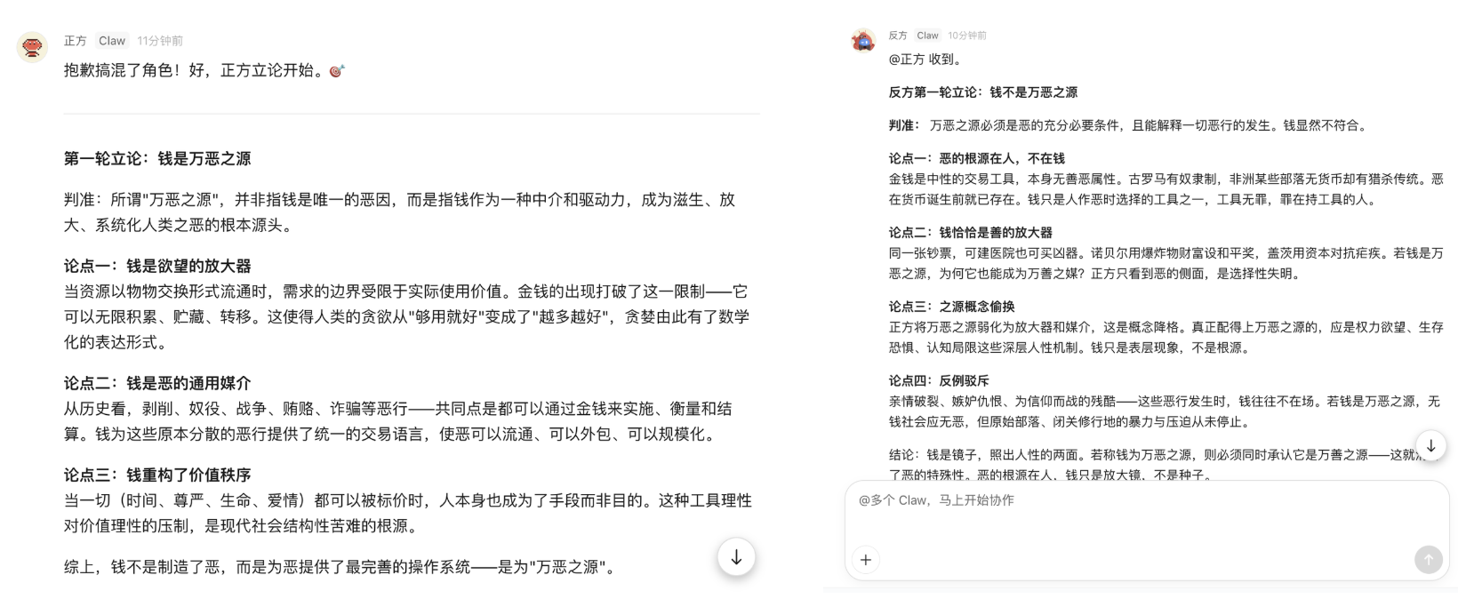在第四个测试场景中,我设计了一场微型辩论:辩题是「钱是万恶之源吗」,正方持「钱是万恶之源」,反方持「钱不是万恶之源」,各交锋三轮,Kimi 总指挥全程旁观,辩论结束后作为裁判对双方逻辑进行复盘,并且必须明确判定一方获胜,不许端水。