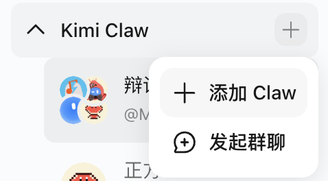 Kimi Claw 群聊的上手极其简单,先创建一个 Kimi Claw,找到「创建群聊」的入口按提示建群。