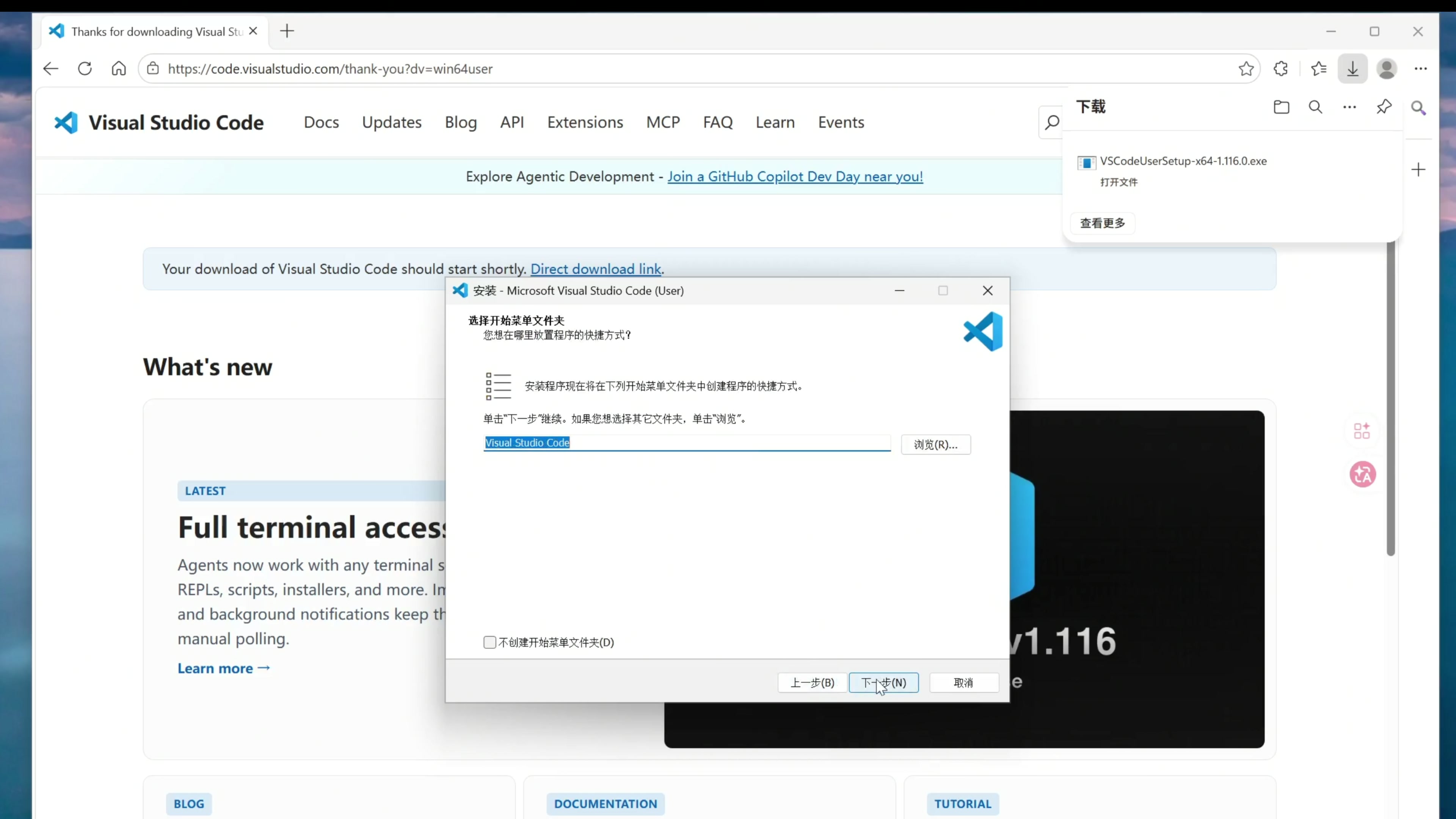 下一步我们来安装 VS Code 。VS Code 是一款轻量且功能强大的代码编辑器,几乎支持所有的编程语言,是我们使用 AI Agent 进行代码编写的必备软件。我们来到 VS Code 的官网