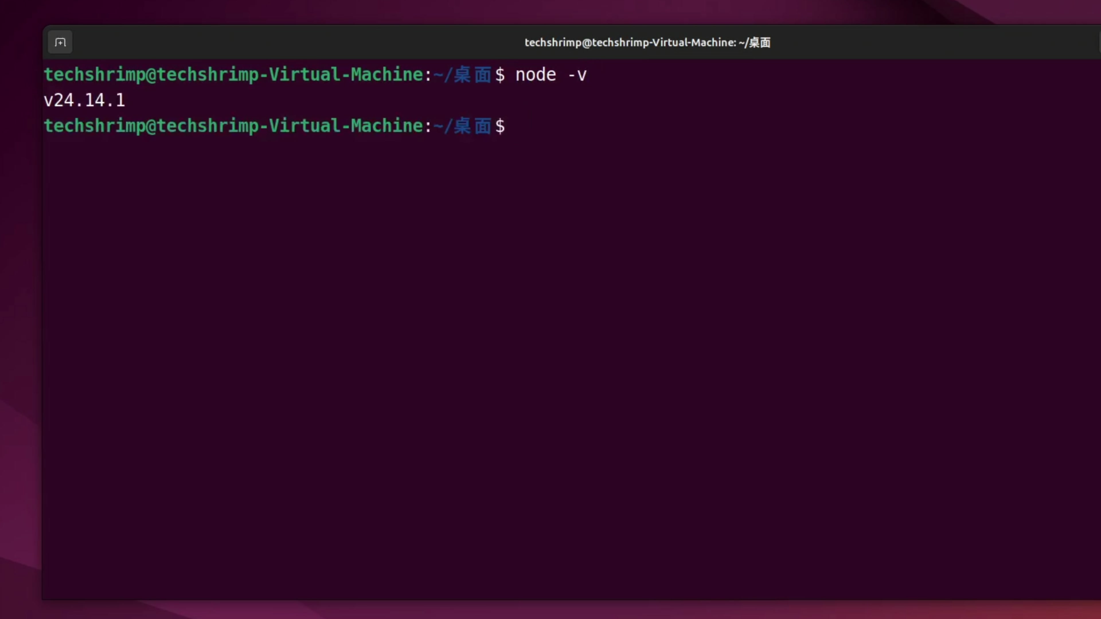 我们在 APP 里面找到终端打开终端,先输入 touch 创建一个 shell 的配置文件,然后把下面几个命令复制过来依次执行。这样就把 nodejs 24 安装到了电脑上。然后我们输入命令 node -v 还有 npm -v ,这里都成功打印出了版本号,我们的 nodejs 就安装完成了。