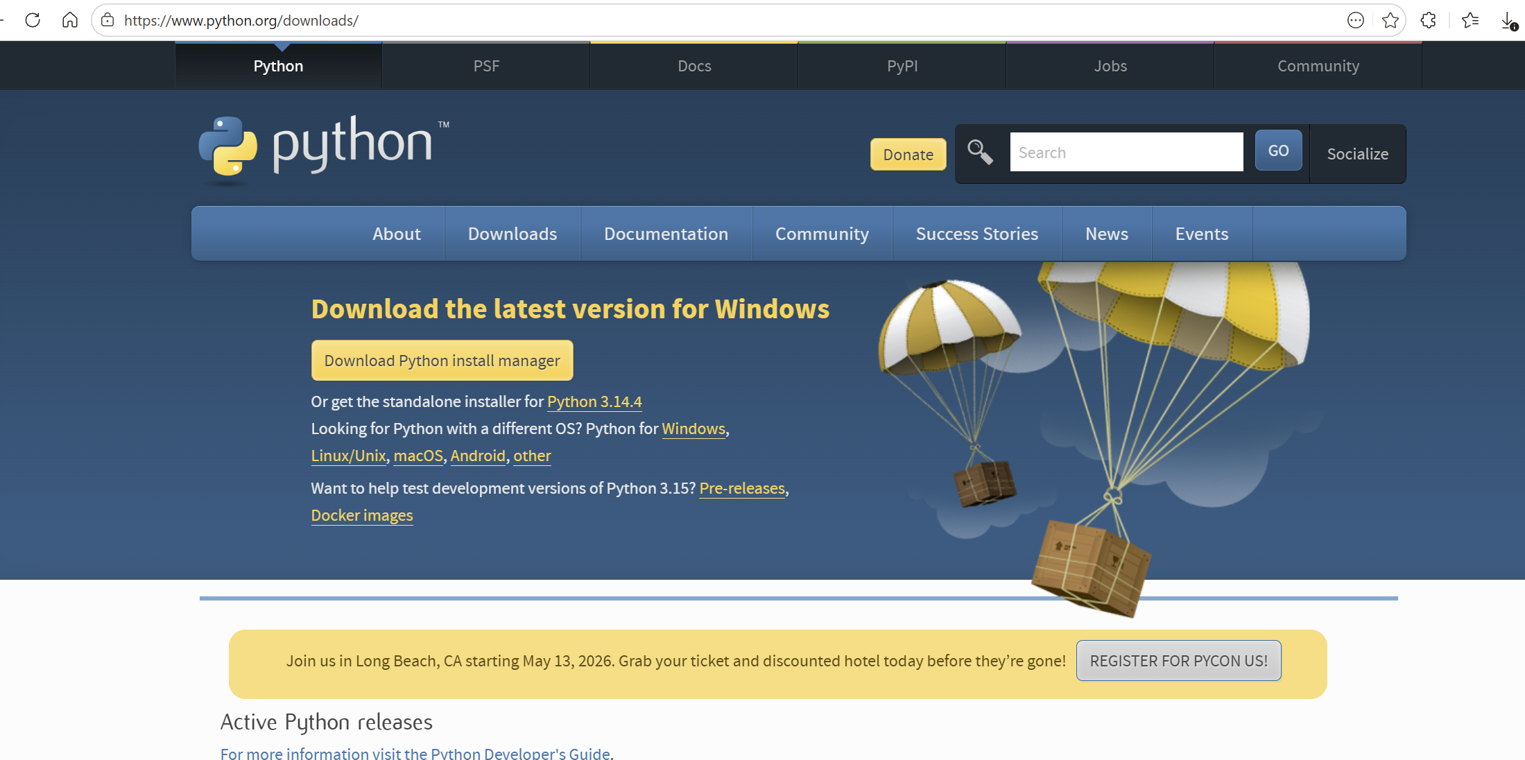 接下来我们来安装 Python 。Python 是一个非常流行的编程语言,很多 Agent skills 附带的脚本都是依赖 Python 才能运行的。我们来到 Python 的官网,在 download 这里点击 Python install manager 下载 Python 安装器。