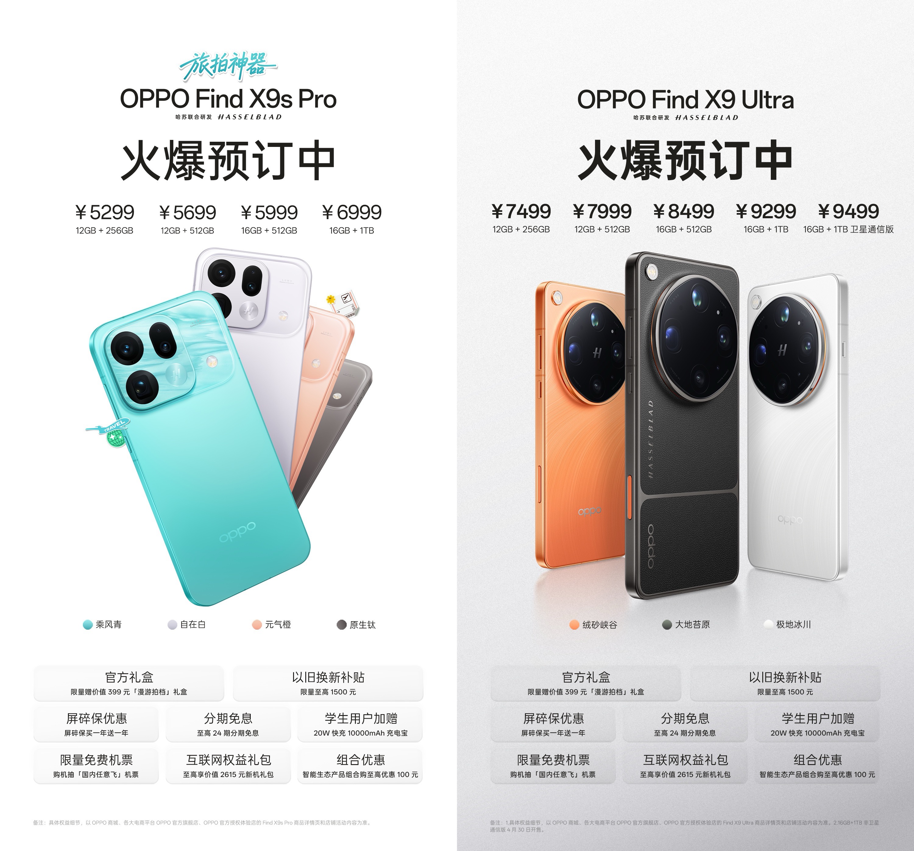 OPPO 于昨晚举行新品发布会,正式推出 Find X9 Ultra、X9s Pro 系列及多款平板、可穿戴新品。Find X9 Ultra 起售价 7499 元,顶配卫星通信版售价 9499 元,哈苏大师套装版则达 11999 元。搭载第五代骁龙 8 至尊版处理器,主打旗舰影像: