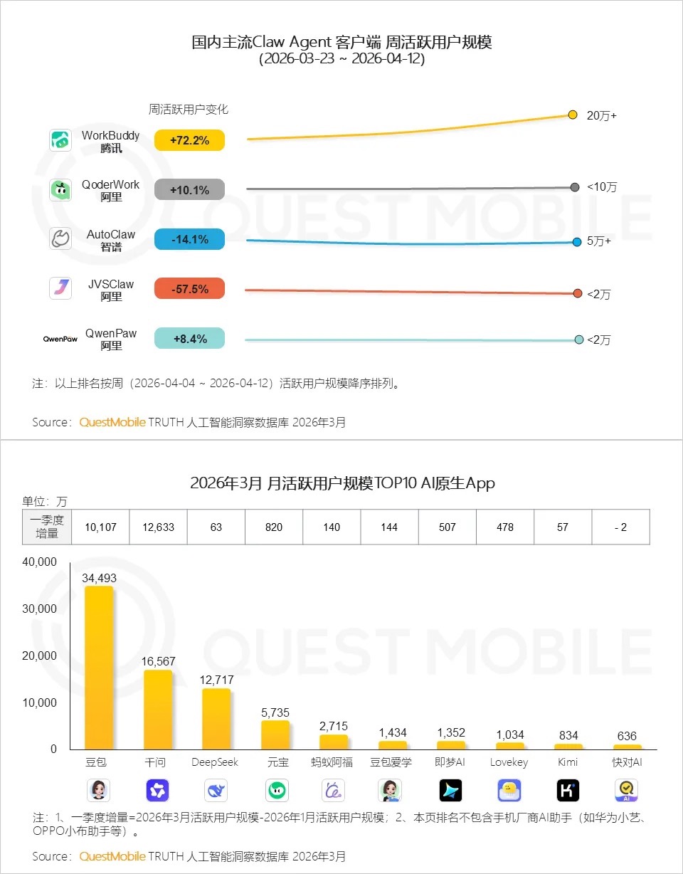 QuestMobile:今年一季度 AI 原生 App 月活破 4.4 亿、腾讯 WorkBuddy 周活大增 72.2%