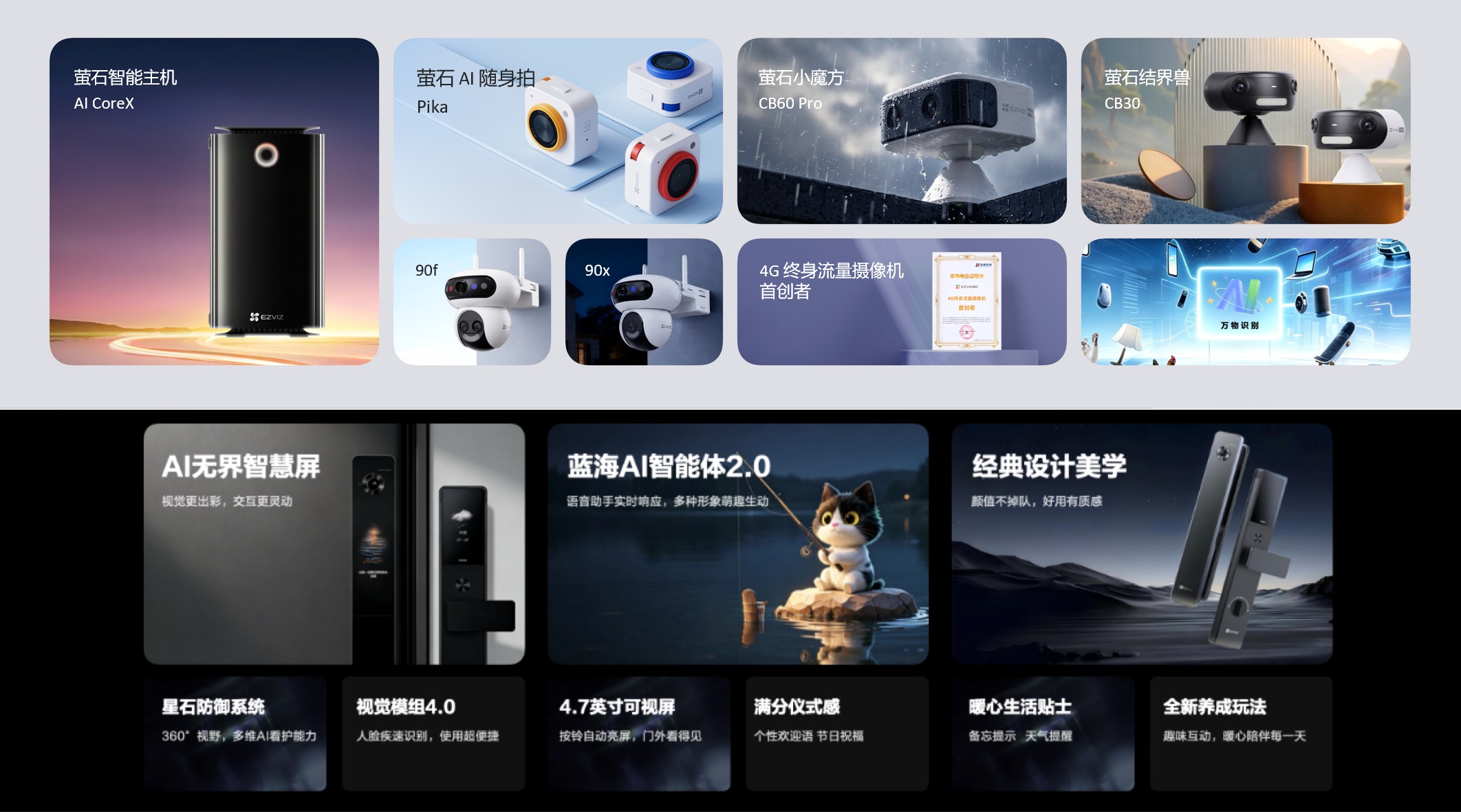 - EZVIZAICoreX:本地智慧中枢,搭载蓝海大模型 2.0 与 Home Vita AI 智能体,配备 24G+128G 内存与 64T 算力,支持全屋设备统一管控、自然语言检索录像及自动生成录像摘要,将率先在海外市场首发;