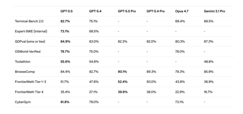 We don’t have SWE-Bench Pro scores for Anthropic’s Opus 4.7, but on SWE-Bench Pro, it reached 64.3%, which is one area where Opus still has the upper hand, it seems. But on Terminal-Bench 2.0, GPT 5.5 scores 82.7%, while Opus only reaches 69.4%.