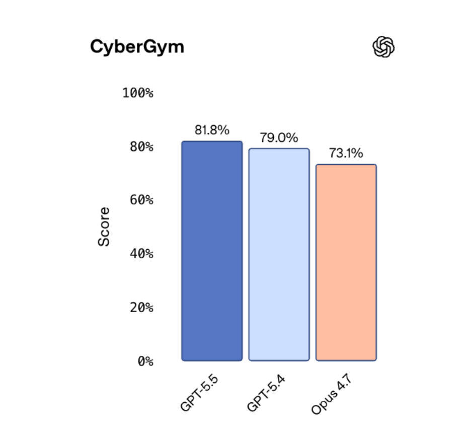 On the CyberGym benchmark, GPT-5.5 scores 81.8%. Mythos, according to Anthropic, scored 83.1%.